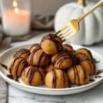 The image shows a white round plate filled with small round dough balls covered in a cinnamon sugar coating, giving them a warm golden-brown color with a slightly textured surface. Each dough ball is drizzled with dark chocolate sauce in thin, uneven lines across the top. A single dough ball is held by a gold fork, showing its smooth, soft texture coated with the chocolate drizzle. The plate is placed on a white marbled surface, with a white ceramic pumpkin and a lit candle holder softly blurred in the background, adding a cozy atmosphere. Photo taken with an iphone --ar 4:5 --v 7