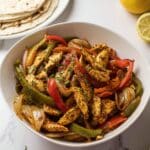 A white bowl filled with cooked chicken strips mixed with sautéed vegetables, including red, green, and yellow bell peppers, along with sliced onions. The chicken pieces are golden-brown with a slightly charred texture, while the vegetables show vibrant colors and a soft, glossy look. The dish is sprinkled with finely chopped green herbs, adding a fresh touch. In the background, there is a stack of tortillas on a white plate and a lemon half on the white marbled surface. photo taken with an iphone --ar 4:5 --v 7