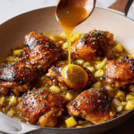 A close-up of six golden-brown chicken thighs with crispy, caramelized skin arranged evenly in a white pan on a white marbled surface. Underneath the chicken are small, diced yellow pieces and light green herbs scattered on top. A woman's hand holding a wooden spoon is pouring a glossy, thick golden sauce over the chicken, with a thin stream flowing down and a few lemon slices resting on top of the central piece. The pan handle extends slightly out of view, and the lighting highlights the shiny texture of the sauce and chicken skin. photo taken with an iphone --ar 4:5 --v 7