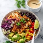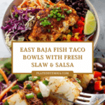 Keywords: Baja fish tacos, fish taco bowls, cod recipe, Mexican inspired seafood, healthy fish tacos, cabbage slaw, black bean corn salsa