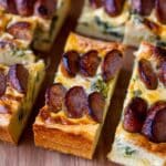 The image shows several rectangular pieces of a savory dish arranged on a wooden surface, each piece having three main layers. The bottom layer is a thick, golden-brown crust with a slightly rough texture and a firm edge. Above this is a creamy, pale yellow layer mixed with green bits, creating a soft and moist texture. The top layer consists of browned, sliced sausage pieces arranged in a row, with the sausage slices showing a rich brown color and some charring, adding contrast and texture. The dish appears hearty and warm. photo taken with an iphone --ar 4:5 --v 7