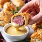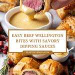Keywords: Beef Wellington, appetizer, puff pastry, seared beef, party bites, mushroom duxelles, prosciutto, dipping sauces