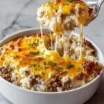 - Layer the Casserole: Grease a 9×13 inch baking dish with butter or cooking spray. Spread the creamy garlic butter rice evenly across the bottom of the dish. Layer the cooked ground beef evenly over the rice. Sprinkle the shredded cheddar cheese over the beef, followed by an even layer of shredded mozzarella cheese on top to ensure a perfect cheese pull.
