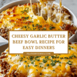 This Beefy Garlic Butter Bowl is a comforting and cheesy one-dish meal that combines savory ground beef with creamy garlic butter rice and a luscious cheese topping. It’s easy to prepare and perfect for a satisfying weeknight dinner.