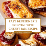 Delicious and elegant Brûléed Brie Crostini featuring toasted baguette slices topped with cherry jam, creamy brie cheese, and a caramelized sugar crust, perfect as a sophisticated appetizer or snack.