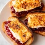 Delicious and elegant Brûléed Brie Crostini featuring toasted baguette slices topped with cherry jam, creamy brie cheese, and a caramelized sugar crust, perfect as a sophisticated appetizer or snack.