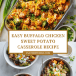 This Buffalo Chicken Sweet Potato Casserole is a flavorful and hearty dish that combines tender chicken, roasted sweet potatoes, and crunchy broccoli all coated in spicy buffalo sauce. Topped with melted cheddar, green onions, and crispy turkey bacon, it’s perfect for a cozy weeknight dinner with a kick.