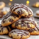 A stack of soft, chunky chocolate chip cookies is placed on a white plate with a subtle texture. Each cookie is light golden brown with dark chocolate chips visible throughout. The cookies have a dusting of white powdered sugar on top and a drizzle of glossy dark chocolate in lines across the surface. The plate rests on a white marbled texture, and there are soft, warm lights blurred in the background. The cookies look thick with a slightly crumbly texture visible on the edges. photo taken with an iphone --ar 4:5 --v 7