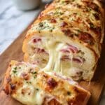 Chicken Cordon Bleu Stromboli is a delicious, savory rolled pizza dough filled with layers of cooked chicken breast, ham, and Swiss cheese, enhanced with a mustard-mayo spread and a buttery, herbaceous topping. This baked stromboli offers a satisfying blend of flavors reminiscent of the classic Chicken Cordon Bleu, perfect as a hearty appetizer or main dish.