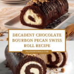 This decadent Chocolate Bourbon Pecan Swiss Roll combines a rich cocoa sponge cake soaked with bourbon, layered with a smooth cream cheese filling, and finished with a luscious chocolate ganache and bourbon caramel sauce. Topped with praline pecans and chocolate shavings, it’s an indulgent dessert perfect for special occasions.
