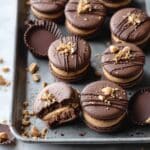 Keywords: Chocolate macarons, Peanut butter filling, Swiss meringue, French dessert, Almond flour cookies, Elegant desserts, Party treats