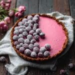 A round tart with a crumbly brown crust forming the base, filled with a smooth, bright pink layer that looks creamy and glossy. On top, there are many small round berries covered partly in frosty white sugar, arranged loosely across the surface. The tart is placed on a white cloth on a dark wooden table, with a few berries scattered around, and there are soft pink flowers in the background. photo taken with an iphone --ar 4:5 --v 7