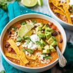 A hearty and flavorful Chicken Tortilla Soup featuring crispy bacon, a medley of vegetables, black beans, enchilada sauce, and tender shredded chicken, topped with creamy cheese and zesty lime. This comforting soup is finished with oven-baked tortilla strips for a satisfying crunch and customizable toppings like avocado, cotija cheese, and sour cream.
