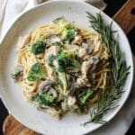 This creamy leftover rotisserie chicken pasta is a quick and comforting meal perfect for using up leftover chicken. Tender pasta is combined with sautéed onions, broccoli, and mushrooms in a rich cream sauce, finished with plenty of Parmesan cheese for a luscious, flavorful dish.