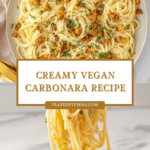 Keywords: vegan carbonara, creamy vegan pasta, plant-based carbonara, tofu carbonara, mushroom bacon, vegan pasta recipe