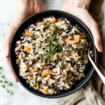 A black bowl held by a woman's hands filled with a creamy mixed dish made of small rice grains, chopped orange vegetables, green herbs, and dark wild rice pieces scattered on top. A sprig of fresh green thyme lays across the top center, adding contrast. The texture looks thick and slightly chunky with bits of green herbs sprinkled throughout. The bowl is against a white marbled texture background, with a beige cloth slightly blurred in the background. A silver spoon is placed inside the bowl on the right side. photo taken with an iphone --ar 4:5 --v 7