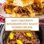Keywords: Mississippi pot roast sliders, slow cooker sliders, crockpot pot roast, shredded beef sandwiches, Hawaiian roll sliders, pepperoncini beef sliders