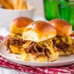 Keywords: Mississippi pot roast sliders, slow cooker sliders, crockpot pot roast, shredded beef sandwiches, Hawaiian roll sliders, pepperoncini beef sliders