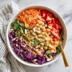 This Crunchy Thai Chickpea Salad is a vibrant and refreshing dish packed with a colorful mix of vegetables and a tangy, creamy tahini-based dressing. Perfect as a light meal or a flavorful side, it combines crisp bell peppers, shredded carrots, red cabbage, and chickpeas tossed in a zesty dressing with lime juice, soy sauce, and a hint of honey. Garnished with chopped peanuts, fresh cilantro, and sesame seeds, this salad delivers a satisfying crunch and authentic Thai-inspired flavors.