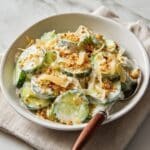 This Cucumber Caesar Salad offers a refreshing twist on the classic Caesar by swapping out romaine for crisp, thinly sliced cucumber. It’s a light, creamy salad perfect for warm days or as a crunchy side dish to your favorite meal.