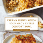 Keywords: French onion soup mac and cheese, caramelized onion mac and cheese, Gruyère mac and cheese, comfort food, creamy mac and cheese, cheesy pasta bake