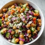 Divorce Salad is a vibrant, make-ahead bean salad combining chickpeas, black beans, crisp red onions, and crumbled feta, all tossed in a tangy oregano vinaigrette. This flavorful, protein-packed salad is perfect for busy days as a quick lunch or a satisfying side dish.