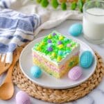 Keywords: Easter cake, poke cake, colorful cake, white chocolate pudding cake, festive dessert, spring dessert, whipped cream topping