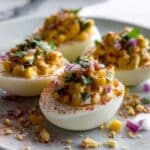 Elote Deviled Eggs combine the creamy richness of classic deviled eggs with the zesty flavors of Mexican street corn, featuring smoky chipotle mayo, tangy cotija cheese, and a hint of lime and chili for a festive appetizer perfect for any celebration.