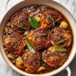 Filipino Chicken Adobo is a classic and beloved dish featuring tender chicken simmered in a rich, tangy, and savory sauce made from soy sauce, cane vinegar, garlic, and aromatic spices. This recipe uses bone-in chicken thighs and drumsticks, seared for a crispy exterior and then simmered to juicy perfection before finishing under the broiler for a beautifully caramelized finish. Serve it with steamed white rice to soak up the flavorful sauce.