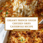 Keywords: French onion chicken casserole, orzo casserole, baked chicken pasta, comfort food, one-pot dinner