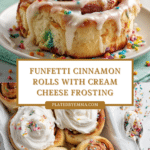 - Cream Cheese Frosting: Beat together the cream cheese and softened butter until smooth. Gradually add sifted powdered sugar and continue beating until thick and smooth. Spread this frosting over the warm cinnamon rolls and garnish with additional confetti sprinkles if desired.
