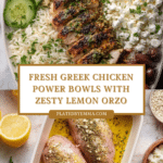 Keywords: Greek chicken, lemon orzo, power bowls, grilled chicken recipe, Mediterranean chicken bowl, healthy lunch, easy dinner, tzatziki