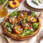 A wooden bowl filled with a bed of fresh mixed green and purple leafy salad forms the base layer, with grilled peach halves placed on top. Each peach half is charred with grill marks and topped with small dollops of blue cheese and sprinkled with finely chopped herbs. Scattered around the peaches are crispy bacon pieces adding a deep reddish-brown color and crunchy texture. The bowl sits on a white marbled surface, with fresh peaches, a jar of honey with a wooden dipper, a few forks wrapped in beige napkins, and a white plate with a piece of blue cheese blurred softly in the background. photo taken with an iphone --ar 4:5 --v 7