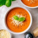 - Serve and Garnish: Pour the blended soup into bowls. Top with freshly ground pepper, parmesan cheese, and fresh basil leaves if desired. Serve immediately for best flavor and texture.