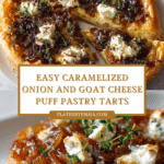 Keywords: caramelized onion tart, goat cheese tart, puff pastry appetizer, vegetarian tart, easy appetizer recipe, French-style tarts