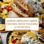 Keywords: Greek chicken, tzatziki sauce, couscous recipe, Mediterranean chicken, lemon oregano chicken, healthy chicken dinner, Greek yogurt sauce