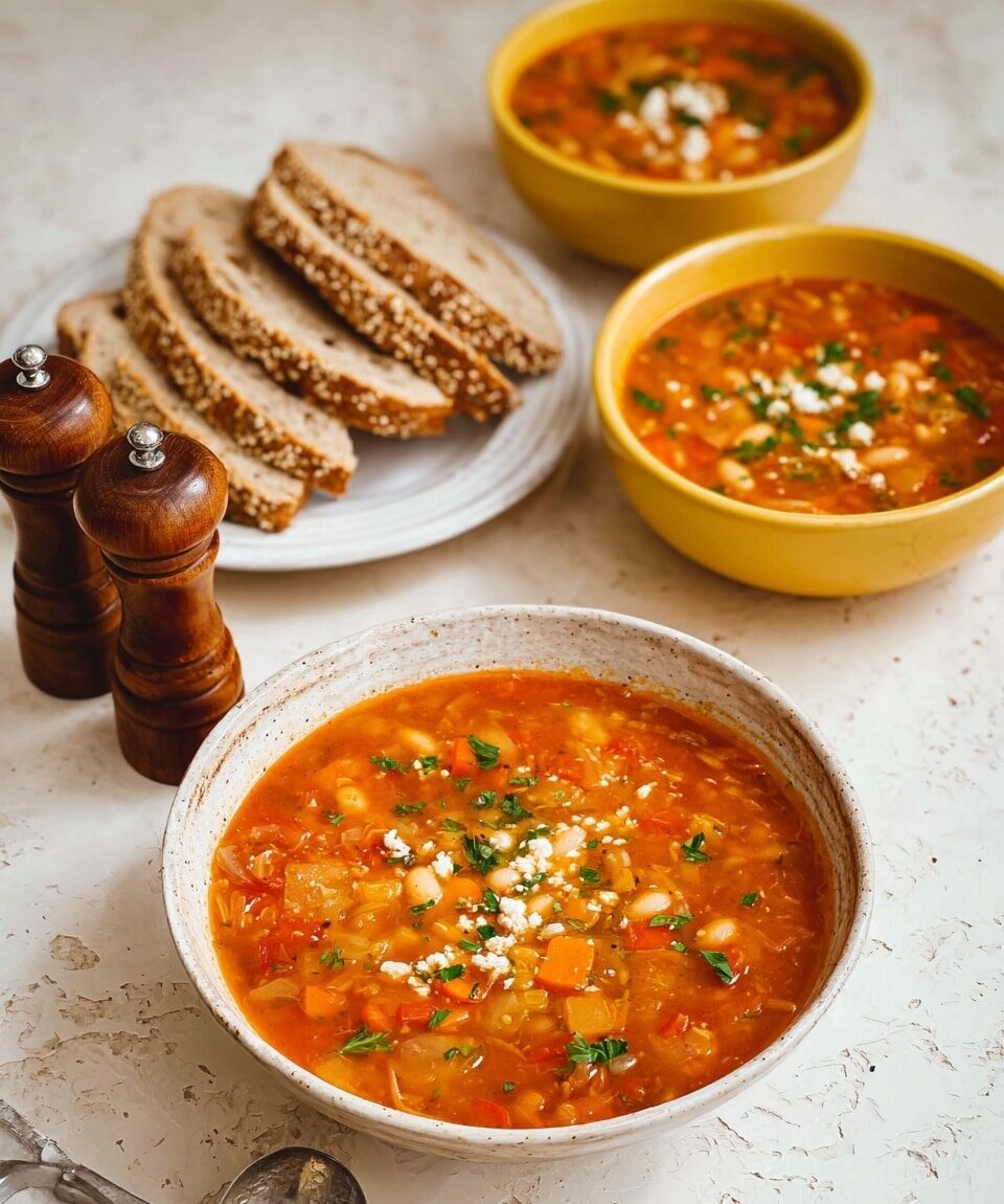 This Mediterranean White Bean Soup is a hearty and flavorful dish combining tender white beans, fresh vegetables, and aromatic herbs. Simmered to perfection and finished with tangy feta, Parmesan, and a hint of lemon, it offers a comforting yet healthy meal inspired by Mediterranean cuisine.