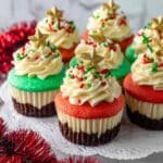 These Mini Christmas Cheesecakes are the perfect festive treat with a delicious Oreo cookie crust and creamy marbled red and green cheesecake batter. Easy to make and beautifully decorated with whipped cream and sprinkles, these bite-sized cheesecakes are great for holiday celebrations and gatherings.