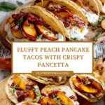 Keywords: Pancake tacos, caramelized peaches, crispy pancetta, whipped cream, brunch recipe, sweet and savory pancakes