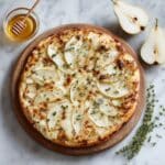 This Pear and Brie Pizza is a delightful combination of sweet and savory flavors featuring thinly sliced pears, creamy brie cheese, crunchy walnuts, and fresh thyme on a homemade, chewy pizza dough. Drizzled with honey and baked to golden perfection, it makes a sophisticated and unique pizza perfect for entertaining or a special meal.