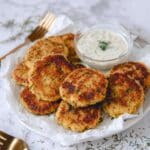 A white round plate with six golden brown, slightly crispy patties stacked close together, each showing a textured surface with small green herb bits. The patties have a rustic look with some darker browned spots, and are arranged on white parchment paper in a loose circle. On one side of the plate is a small clear glass bowl filled with creamy white dipping sauce with small green herb flecks. The plate sits on a white marbled surface sprinkled with dried green herbs, with two golden forks placed nearby. photo taken with an iphone --ar 4:5 --v 7