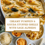 Keywords: pumpkin pasta, stuffed shells, gouda cheese, brown butter sauce, sage Alfredo, fall recipes, creamy pasta bake, vegetarian dinner
