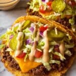 These Smash Burger Tacos combine the juicy, crispy goodness of classic smash burgers with the convenience and fun of tacos. Ground beef is spread thin and cooked crispy on flour tortillas, topped with melty American cheese, fresh diced onions, dill pickle chips, and shredded iceberg lettuce for a deliciously satisfying meal perfect for any casual occasion.