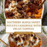 Keywords: sweet potato casserole, Southern casserole, maple syrup recipe, holiday side dish, roasted sweet potatoes, pecan topping, marshmallow casserole