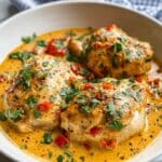 The dish shows four large pieces of cooked chicken in a shallow white bowl, covered in a creamy orange-yellow sauce with visible black pepper and red bell pepper pieces. Each chicken piece is topped with fresh chopped green herbs, likely cilantro, adding a touch of bright green contrast. The chicken looks moist with a slightly browned, tender texture on top. The bowl rests on a white marbled surface with a soft focus on a blue and white checkered cloth in the background. The sauce pools evenly around the chicken, creating a rich and inviting visual. photo taken with an iphone --ar 4:5 --v 7