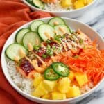 - Add Toppings and Sauce: Drizzle the spicy mayo over the salmon and rice, then add sliced jalapeños, cucumber, shredded carrots, and chopped mango for freshness and crunch.