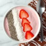 A refreshing and nutritious Strawberry Banana Smoothie Bowl made with frozen strawberries and banana, creamy vanilla Greek yogurt, and milk. Topped with shredded coconut, chia seeds, and fresh strawberries for added texture and flavor. Perfect for a healthy breakfast or snack.