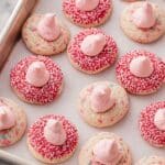 Keywords: Strawberry Kiss Cookies, Funfetti sugar cookies, cream cheese cookies, Hershey’s Kiss cookies, holiday cookies, funfetti dessert, soft sugar cookies