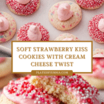 Strawberry Kiss Cookies are delightful soft sugar cookies made with Funfetti sugar cookie mix and cream cheese, rolled in pink or white sanding sugar or non-pareils for a sweet, crunchy coating. Each cookie is topped with a Hershey’s Strawberry Ice Cream Cone Kiss, creating a perfect blend of creamy, fruity, and sugary flavors ideal for parties or everyday treats.
