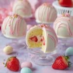 Delight in these festive Strawberry Shortcake Easter Egg Bombs featuring a creamy strawberry shortcake filling encased in a crisp white chocolate shell. Perfect for spring celebrations, these indulgent treats combine the sweetness of freeze-dried strawberries, jam, and shortcake crumbs with a decorative touch of pink chocolate drizzle and edible gold sprinkles.
